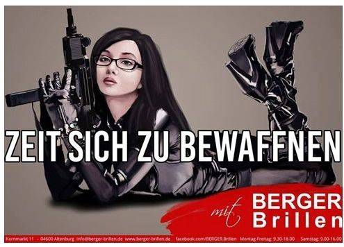 Als gewaltverherrlichend beanstandet der Werberat die Anzeigen- und Internetwerbung des Augenoptikers Berger Brillen. Das Unternehmen wirbt mit der Abbildung einer Frau mit Maschinengewehr in der Hand und dem Slogan "Zeit sich zu bewaffnen". Nach Ansicht des Werberats werde durch die Werbemaßnahme zur Gewaltanwendung aufgerufen. Insbesondere vor dem Hintergrund der aktuellen gesellschaftspolitischen Debatten und Entwicklungen mit Blick auf die Flüchtlingsthematik sei ein derart offensiver Gewaltappell gesellschaftlich nicht akzeptabel (Verstoß gegen die Grundregeln zur kommerziellen Kommunikation des Deutschen Werberats).