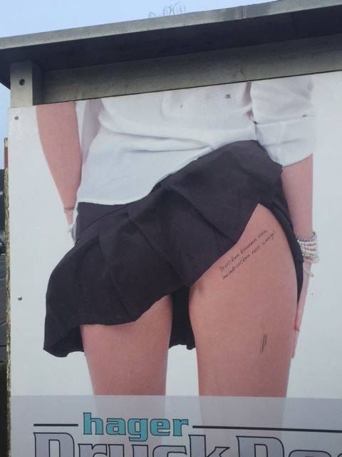 Das Motiv zeigt eine Frau von hinten mit kurzem, hochfliegenden Rock und dem wie tätowiert wirkenden Werbetext "Drucken können viele, beeindrucken nur wenige!" auf dem Oberschenkel. Dadurch werde die Frau mit der beworbenen Dienstleistung gleichgesetzt und damit zum Objekt degradiert, so der Werberat.